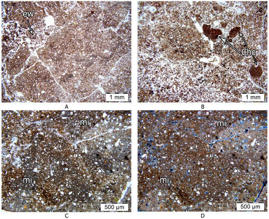 Microstructure of Calcic horizons. (A)—rectangular structure of silty-clay carbonate material with earth-worm (ew) casts (65–80 cm, PPL); (B)—silty-clay micromass with abundant fine fragments of Chocolate clays of various shapes (40–65 cm, PPL); (C,D)—heterogeneous micritic impregnation (mi) of the groundmass (65–80 cm, (C)—PPL, (D)—XPL).