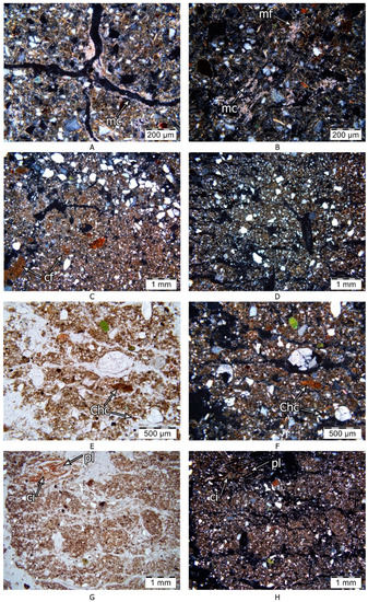 The microstructure of Mollic and Cambic horizons of Kastanozem: (A)—dense silty clay micromass with blocky aggregates, high birefringence, and thin micritic coatings (mc) (20–40 cm, XPL); (B)—thin micritic coatings (mc) and infillings (mf) in the micromass (20–40 cm, XPL); (C)—loose silty clay micromass with sand streaks and abundant clay fragments (cf) of various shapes (9–20 cm, XPL); (D)—transformation of rounded biogenic aggregates into thin platy aggregates and circular orientation (0–9 cm, XPL); (E,F)—loose silty-clay-humus micromass with sand grains and fine granular and platy microstructure. With rare fragments of Chocolate clays (Chc) (0–9 cm, e–PPL; f–XPL); (G), (H)—carbonate impregnation (ci) within plant (pl)tissue (0–9 cm, g–PPL; h–XPL).