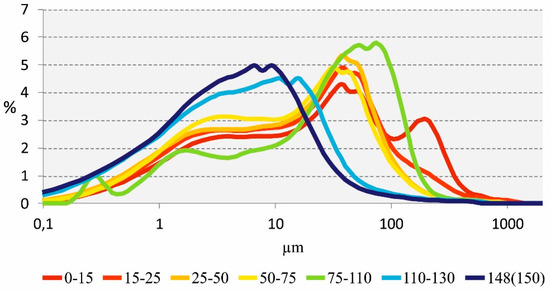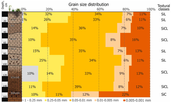 Grain size distribution (Figure 10) confirms that the pedocomplex includes several sediment layers. The lower part (148–160 cm) is formed in Silty clay that is typical for mono-clay layers of Chocolate clays. The upper part of the pedocomplex (0–100 cm) is formed in Silt loam and Silty clay loam with the high content of loess fraction (coarse silt) and fine sand that is typical for sandy loess sediments. Texture variability within the loess layer relates to the variable admixture of clay aggregates (see Section 4.2.). The admixture of sand grains in the upper 20 cm also correlates with microfeatures. In spite of abundant clay fragments recorded in the field and in thin sections, the texture of the middle part (100–148 cm) is similar to the overlying loess layer.