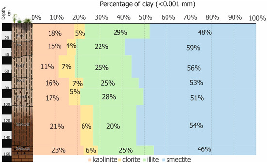Clay mineralogy. Smectites are dominant in all parts of the pedocomplex; except for the upper layer, their content decreases with depth. Illite is also abundant, comprising up to 30% of the total mineral content. Other clay minerals show slight variability (Figure 11).