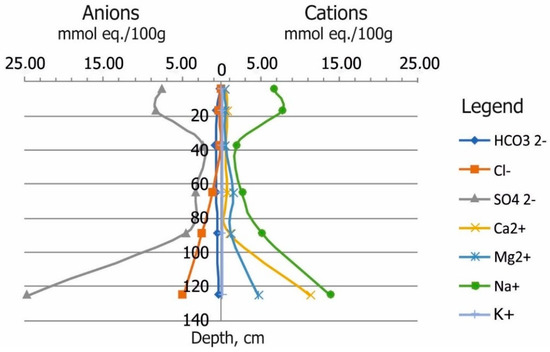 pHH2O was determined using a potentiometer, in suspension with a soil to water ratio of 1:2.5, after a single shaking step followed by settling for 30 min. The composition of the water extract (1:5), Calcium carbonate content, gypsum, and exchangeable acidity were analyzed using conventional methods [29]. Calcium and Magnesium in the water extract were determined by complexometric titration, and Sodium and Potassium were detected by flame photometry. Total alkalinity was determined by titration with sulfuric acid on the indicator methyl orange. The content of chloride ions was determined by the argentometric method according to Moor, and the content of sulfate ions by precipitation titration according to Aidinyan. Exchange bases were determined by the Pfeffer method in the modification of Molodtsov and Ignatova [29]. The total content of sulfate ions was determined by the gravimetric method [30]. Salinity was assessed according to the criteria given in the monograph “Salt-affected soils of Russia” (2006) [31].