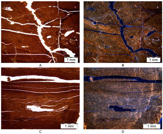 Microstructure of mono-clay layers of Chocolate clays untouched by pedogenesis. Left–PPL; right–XPL. (A,B)—Leninsk exposure, 25 km East of Srednaya Akhtuba section, right side bank of Akhtuba River, 231–236 cm; (C,D)—Raigorod exposure, 20.