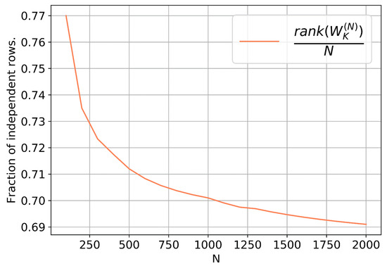 Dependence of the proportion of linearly independent rows on the size of the matrix .