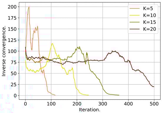 Dependencies of inverse convergence for a seismic trace with for a different number of reflecting coefficients K.