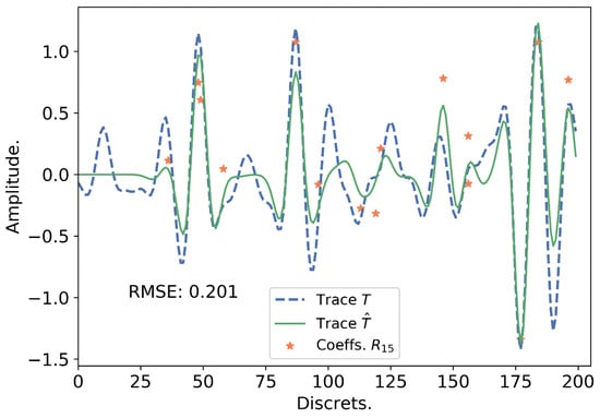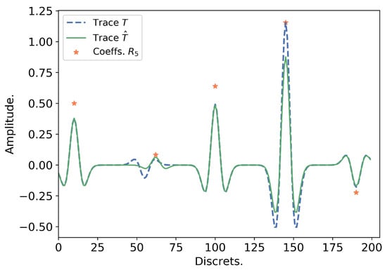 According to book [7] by a model signal we mean a Ricker wavelet with a certain frequency f and a center in a sample number . The wavelet is also a vector of amplitudes and is defined in the same space as the seismic trace. The amplitude of the wavelet with center at in j-sample will be marked as . Then, Equation (1) for a seismic trace can be represented as a sum of amplitudes of wavelets with corresponding reflection coefficients (2):