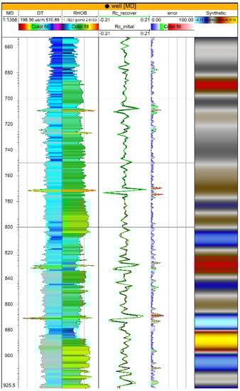 The result of the application of the algorithm A0 on the acoustic model of the well: DT is the curve of the acoustic logging; RHOB—density curve; Rc initial—reflection coefficient curve; Rc recover—restored curve of reflection coefficients; error—relative error values (color settings: blue—error less than 10%, green—error 10–20%, red—error more than 20%); Synthetic is a model wave field.