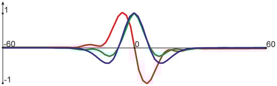 Wavelets used for the formation of acoustic models in the well: blue—Ricker wavelet with a dominant frequency of 30 Hz (model 1); green—statistical pulse from seismic data (model 2); red—statistical pulse with a phase rotation of 90 degrees (model 3).
