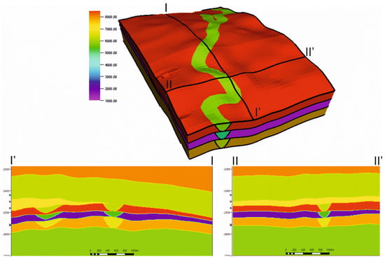 Within the framework of the study, a three-dimensional synthetic model of acoustic impedance is considered as a practical case. To form the model, seven contrasting isotropic layers were used in which was placed a channel system with differing acoustic properties from the enclosing strata (Figure 11). The width of the channels is 250 m; the thickness varies from 0 to 30 m.