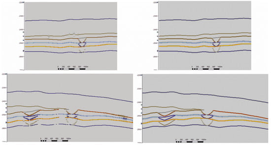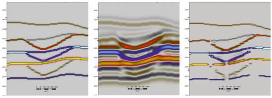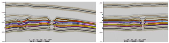 Comparison of the reflection coefficient sections allows us to establish a high degree of similarity between reflection coefficients reconstructed from the seismic trace using the algorithm and the original reflection coefficients incorporated in the model (Figure 14). It should be noted that, in places that the ambiguous operation of the algorithm is observed, expressed in the “skipping” of the coefficient or the appearance of the zone of “blurring” of the boundary. However, in the areas of wedging of seams, for example, in the channel edge zone, where interference appears, the algorithm manages to reconstruct the model correctly.