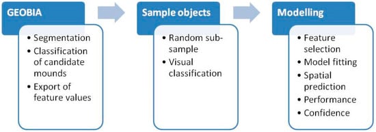 The general research strategy consisted of three major elements and is outlined in Figure 2: geographic object-based image analysis (GEOBIA) [,], visual classification of sample objects and modelling the spatial distribution of carbonate mounds. Initially, image segmentation was carried out to derive image objects (polygons) from suitable raster derivative layers. The aim was to form objects that were either complete mounds (especially smaller ones) or parts of these (e.g., top, slope, foot). In a subsequent step, candidate mounds were defined by applying a simple rule-based classification. These candidate mounds would ideally contain all true mounds, but unavoidably also a certain number of features that have similar characteristics, but are not carbonate mounds. A wide range of object features was extracted for these candidate mounds and used for further analysis.