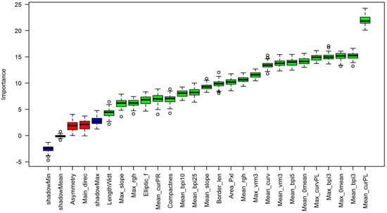 Results of the Boruta feature selection analysis. Green colours indicate important features, red colours indicate unimportant features. Shadow features are shown in blue.