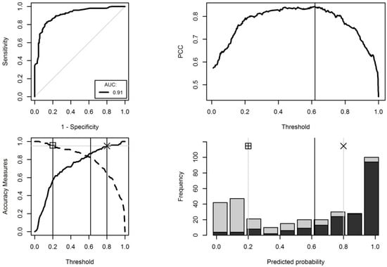 Summary of model performance: Top left—ROC curve (bold black line) indicating AUC = 0.91. The grey diagonal indicates AUC = 0.5 (no discrimination ability). Top right—PCC versus selected threshold: The threshold selected by maximising the Youden index (0.619) gave the highest PCC. Bottom left—Sensitivity (dashed line) and specificity (solid line) versus selected threshold: Requesting Sens = 0.95 and Spec = 0.95 gave thresholds of 0.2 and 0.8, respectively. Bottom right—Histogram showing the frequency of presence (black) and absence (grey) observations against the predicted probability.
