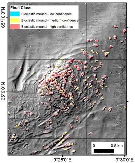In Norway, ‘bioclastic sediments’ associated with carbonate mounds have been mapped as part of the MAREANO (Marine AREA database for NOrwegian coast and sea areas) seabed mapping programme. Such maps give a good approximation of the occurrence of carbonate mounds []. However, for many applications including marine spatial planning and conservation, these products are too generalised as they do not pinpoint individual mounds, nor do they convey the confidence in the map products in a spatially explicit manner.
