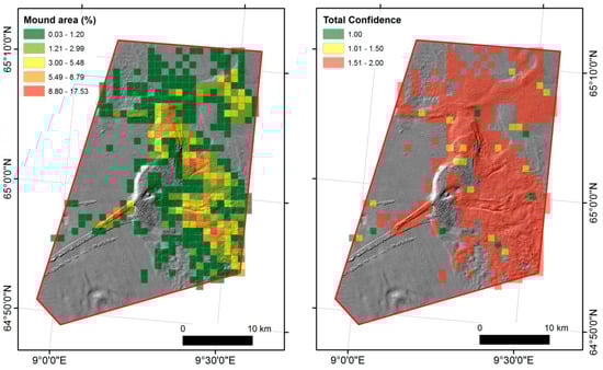 Since carbonate mounds are small features compared to the size of the study area, we represent them in an aggregated form by calculating the fraction of mound area per 1 km2 block. We also display the mean total confidence score in a similar way.