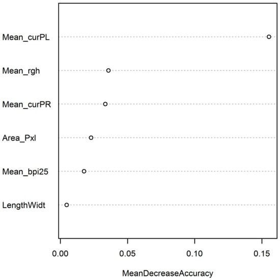 The Boruta feature selection reduced the number of predictor features from 24 to 22 (Figure 3). Two features were deemed unimportant (Asymmetry, Main_direc). The subsequent correlation analysis reduced the number of predictor features to six. All VIFs were below 3 indicating a low degree of multicollinearity in the remaining predictors (Table 5). Mean_curPL, Mean_rgh, Mean_curPR, Area_Pxl, LengthWidt and Mean_bpi25 were used to build the final model.