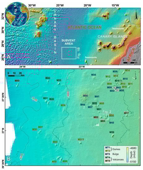 The study area is situated in the central Canary Basin, approximately 500 km west of the volcanic archipelago of the Canary Islands (Figure 1). The Canary Basin is located in an intraplate setting over Jurassic to present oceanic crust [43]. This basin has been characterized as having a heterogeneous distribution of various volcanic elevations including seamounts, hills, and seafloor mounds [42,44]. Nevertheless, in the central area of this basin, known as the Subvent Area, these seafloor mounds are hydrothermal domes and scattered volcanoes related to Quaternary intrusive activity that gave rise to a huge magmatic sill complex together with volcanic activity [41]. Indeed, different morphostructural types (MT) of seafloor mounds have been differentiated according to the height, slope and basal area of these seafloor elevations [42] in agreement with various linked sill intrusions and volcanoes, as reported by [41].