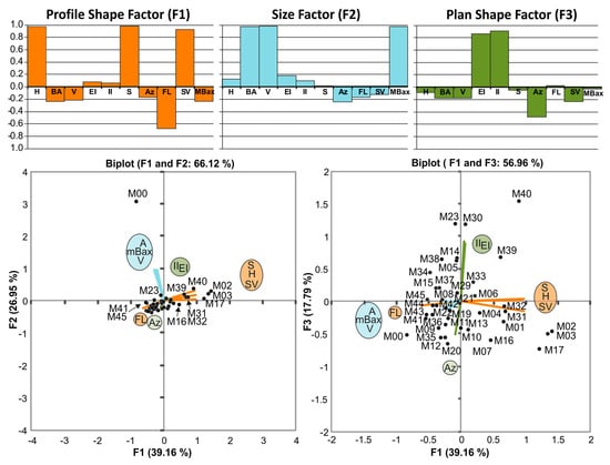 Factor loading plots of the three main principal components that account for 84% of the total variance of the edifices. Factor loads explain the correlations between the PCs and the original variables. Bar plots illustrate which variables are driving the PCs. We have named each factor according to the most significant variables of the analysis. The PCA biplots allow visualization of both the observations (edifices) and the variables among F1-F2 and F1-F3 relationships. Edifices are displayed as points while variables are displayed as linear axes. Standardized values are used to represent the factors.