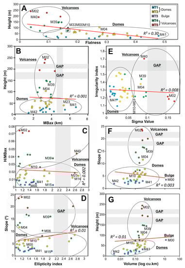 XY scatter plots of the main variables for the forty edifices (n: 40). (A) Flatness (X) vs. Height (Y); (B) Basal length (X) vs. Height (Y) excluding M00 that is considered an outlier; (C and D) Ellipticity index (X) vs. Height/Basal length (Y) and Slope (Y), respectively; (E) Sigma value (X) vs. Irregularity index (Y); and (F and G) Logarithmic (log 10) Volume (X) vs. Slope (Y) Height and (Y), respectively. The five morphometric edifice types are shown and some mismatched edifices are highlighted. The red lines indicate the trend line of each correlation and the R2 coefficient is displayed next to them. The ellipses indicate the natural tendency of the edifice types to cluster, and gaps in the distribution are highlighted by shaded regions.
