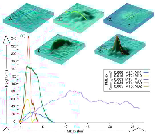 Representative geometry and bathymetric profiles for each type of edifice illustrating the variation in profile shapes. (A) M41 (MT1); (B) M10 (MT2); (C) M00 (MT3); (D) M39 (MT4); (E) M02 (MT5) and (F) Bathymetric profiles of five types of morphometries. The mean aspect H/MBax ratio of each MT indicates that domes are considerably lower than volcanoes.