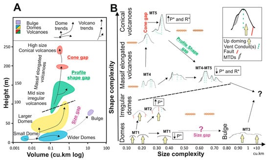 There is a morphometric evolution from mid-sized, irregularly sub-conical volcanoes towards both elongated and conical volcanic edifices, through either preferentially increased volume (MT4) or height (MT5), respectively. This may reflect a critical height range, where two distinct evolutionary paths are possible; irregular sub-cones either continue growing upwards and become large cones (MT5), or grow sideways and become large massif edifices (MT4), resulting in a scarcity of cones in this height range (150–240 m high) (Profile Shape gap) (Figure 7A). The change in eruptive characteristics and features, and consequently volcanic edifice size (Figure 7B), supports an evolution towards these complex shapes with large, high summit areas. MT4 volcanoes may have more than one main vent, thus P* and R* are lower, and evolve from initially smaller, sub-conical volcanoes by vent-up migration. These volcanoes usually have a smooth conical profile in the mBax direction but another that is multi-peaked in the MBax direction (Figure 6 and Figure 7B), as also observed in the morphometric evolutionary trends of American arc volcanoes [35].