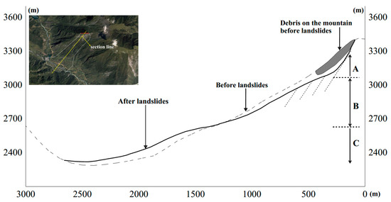 - Part A was the source of the landslide. The slope exposed after the landslide mainly ranged from 55 to 70 degrees, and the depth of the sliding interface reached about 60 m. A width of 350 m, a length of 450 m, and an average depth of about 23 m made up a volume of 3.6 million cubic meters.