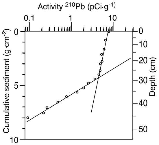 where ρ is the sediment density (used because the depths were given as cumulative mass of sediments rather than as linear distance, cm) Db is the apparent diffusion coefficient (cm−2·yr−1), and λ is the decay constant for 210Pb with a value of 0.03114 yr−1 [17]. From Equation (1), the value for the apparent diffusion coefficient is given by: