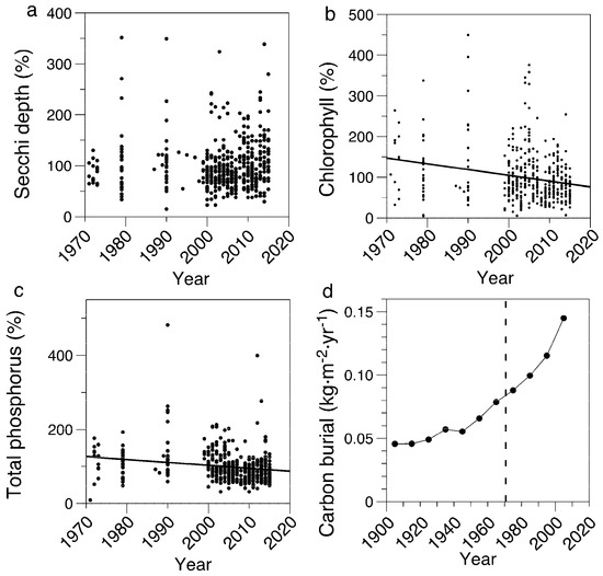 Composite plot of Secchi disk depths for the 24 Iowa lakes with field measurements expressed as per cents of the lake average versus year of sampling (a). The same kind of plots showing statistically significant slopes of chlorophyll ((b) R2 = 0.05, p < 0.0001) and total phosphorus ((c) R2 = 0.05, p < 0.0001) Decadal geometric averages for rates of carbon burial based on 210Pb dating of sediment cores from 33 Iowa lakes using data from Heathcote et al. [11] (d). The vertical dashed line indicates the year 1971 to identify the period with field measurements.