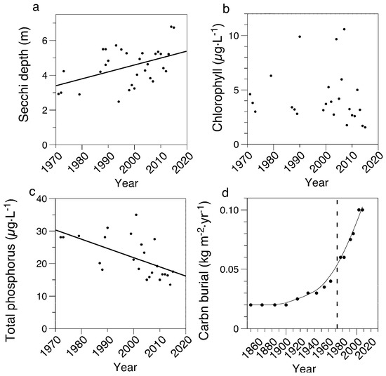 Plots of summer average measurements of Secchi disk depth ((a) R2 = 0.22, p = 0.009) chlorophyll (b), and total phosphorus ((c) R2 = 0.33, p = 0.002) for the period from 1971 to 2015 in Lake West Okoboji. Lines are shown for statistically significant regressions. Rates of carbon burial based on 210Pb dating of sediment cores from Lake West Okoboji using data from Heathcote et al. [11] for the period 1850–2008 (d). The vertical dashed line indicates the year 1971 to identify the period with the field measurements.