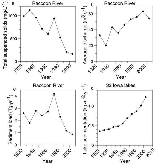 The Des Moines Water Works has been measuring the turbidity of water from the Raccoon River on a daily basis since 1916. Jones and Schilling [20] converted the turbidly readings into total suspended solids concentrations, and in conjunction with water flow measurements calculated sediment transport in the river on a daily basis from 1916 to 2009. Schilling et al. [28] determined that agricultural activities dominated the land uses of the 9389 km2 watershed with 77% of the basin in row crops of corn (Zea mays L.) and soybeans (Glycine max L. Merr.). Information from the Raccoon River, therefore, provided an indication of soil erosion in the upstream watershed, which is similar to the watersheds of the natural lakes in this study (Figure 1). We then compared decadal average values for total suspended solids concentrations, average discharge, and sediment loads from the Raccoon River with the calculated average accumulation rates of dry sediments in the 33 lakes studied by Heathcote et al. [11].