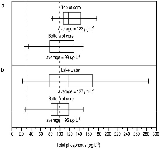 (a) Box plots (minimum, 5%, 25%, median, 75%, 95%, maximum) of diatom-inferred total phosphorus concentrations at the tops and bottoms of sediment cores from 33 Iowa lakes as reported by Heathcote et al. [9]; (b) Box plots for 22 lakes with diatom-inferred concentrations of total phosphorus at the bottoms of cores and average measured concentrations of total phosphorus in the lake waters for 2000–2010. Left dashed line shows the boundary between mesotrophic and eutrophic lakes (30 µg·L−1) and the right dashed line shows the boundary between eutrophic and hypereutrophic lakes. (100 µg·L−1).
