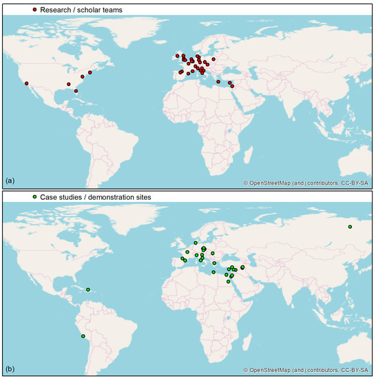 Figure 1b). This is, of course, a sample of the whole scientific community working on remote sensing and geosciences for archaeology and therefore not an exhaustive representation. However, it already provides a glimpse of the widespread expertise of experimental research and field practice, and proves how widely remote sensing is applied to investigate and preserve archaeological heritage.