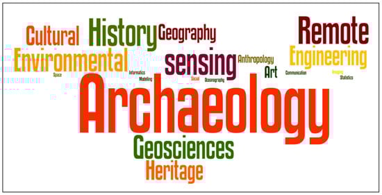 Figure 2 is a word cloud of the disciplines and scientific domains the authors of the papers published in the Special Issue belong to, as inferred from their affiliations. “Archaeology” is predominant and “geosciences” is the second most populated discipline, as expected due to the specific target of the Special Issue. Nevertheless, it appears that other disciplines are well represented, including “remote sensing”, “engineering”, “environmental sciences”, “cultural heritage”, “history”, and “geography”. This is a further proof of the multi-disciplinary nature of archaeological remote sensing.