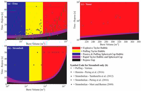 - James, M.R.; Lane, S.J.; Wilson, L.; Corder, S.B. Degassing at low magma-viscosity volcanoes: Quantifying the transition between passive bubble-burst and Strombolian eruption. J. Volcanol. Geotherm. Res. 2009, 180, 81–88. [Google Scholar] [CrossRef]