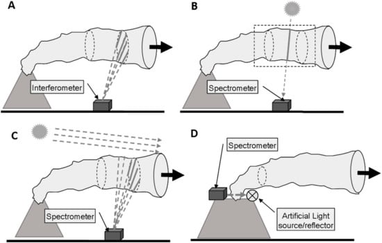 Overview of the different plume sensing schemes: (A) Thermal emission is recorded by passive spectroscopy in the thermal infra-red; (B) Direct light absorption spectroscopy in the UV, visible, or near IR; (C) Scattered sunlight spectroscopy in the UV or visible spectral ranges; (D) Active absorption spectroscopy in the UV, visible, or near IR.