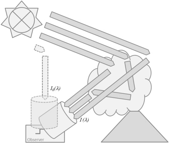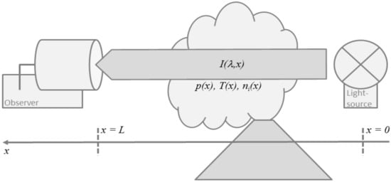 Absorption spectroscopy in the infra-red mostly relies on direct-light approaches i.e., techniques that have a detector which only accepts radiation from a narrow solid angle centred directly on the light source—be it the sun, a hot telluric source (e.g., lava) or an artificial light source. Thus, Figure 2 is directly applicable. The incoming radiance in Equation (3) would be the solar Fraunhofer spectrum for direct sun observations, it would be Planck’s thermal emission spectrum , Equation (9), for a hot opaque source with temperature such as lava, or it would be a silicon carbide lamp (Globar), incandescent lamp, LED (light emitting diode), or laser emission spectrum for artificial light source applications.