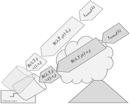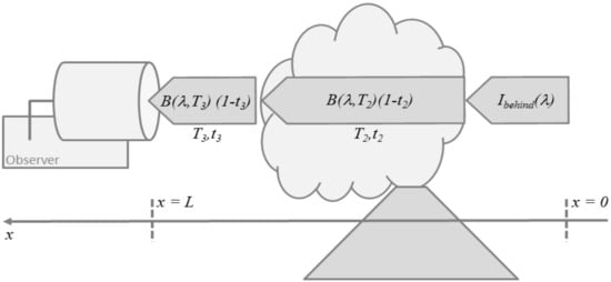 A common view on Equation (13) for volcanic applications is the one shown in Figure 3. The emission along the line-of-sight is assumed to consist of three contributions, the atmospheric background radiance entering the plume from behind, thermal emission by the plume layer (2), and thermal emission by the layer (3) in front of the plume which hosts the observer. Then, Equation (13) simplifies to