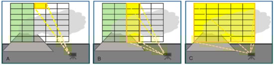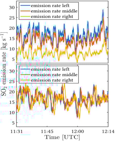 Thus, conceptually, DOAS is fit to use Equations (6) and (7) to infer gas concentrations in volcanic plumes. As illustrated by Figure 5, the plume spectra in Equation (6) are the measurements for which the lines-of-sight cross the volcanic plume. The background spectra are obtained by adjusting the observing geometry such that lines-of-sight avoid the volcanic plume or, if such an adjustment is not possible, by resorting to external sources such as solar spectral atlases []. In practice, this simple approach faces various complications which need to be overcome.
