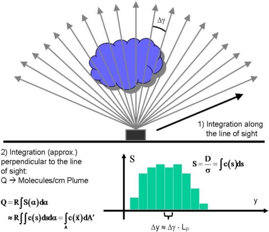 where denotes the slant column density of trace gas species i defined as the concentration integrated along the light path. For atmospheric remote sensing, this assumption typically holds for absorption cross sections in the UV and visible spectral range and thus, the Differential Optical Absorption Spectroscopy (DOAS) technique described in Section 2.3.1 adopts Equation (5). In the infra-red, the assumption is not generally applicable and absorption spectroscopic techniques need to start out from Equation (4) (Section 2.3.2), unless the absorbing gases can be safely assumed to only exist in a single plume layer with homogeneous pressure, temperature etc.