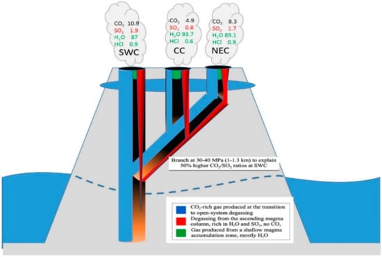 - The composition and emission rate of volcanic gases are linked to processes occurring in the Earth’s interior, therefore measuring volcanic gases provides insights into these otherwise largely inaccessible processes. For instance, already Noguchi and Kamiya [] showed that eruptions of Mt. Asama (Japan) could be forecast with some degree of accuracy by measuring the variable partitioning of sulphur species, chlorine species, and carbon dioxide in the emissions from the active crater. Malinconico [] showed first that also the amount of gas, in particular the amount of emitted SO2 varies when the volcanic activity changes. Several authors (e.g., [,]) used the measured SO2 emission also to calculate the amount of magma involved in the simultaneously observed volcanic activity.