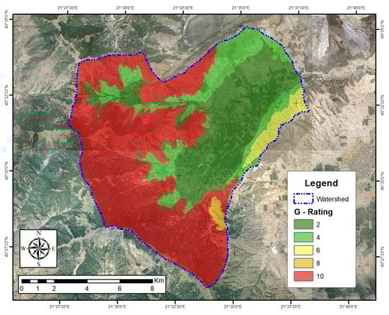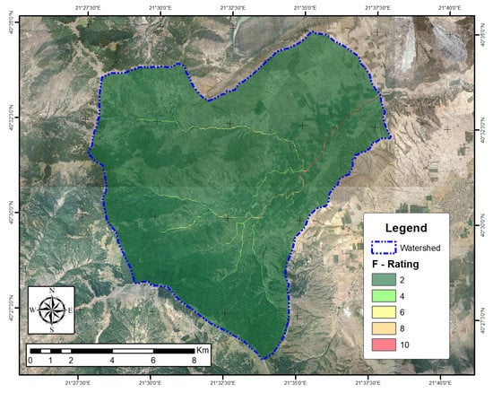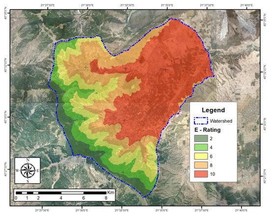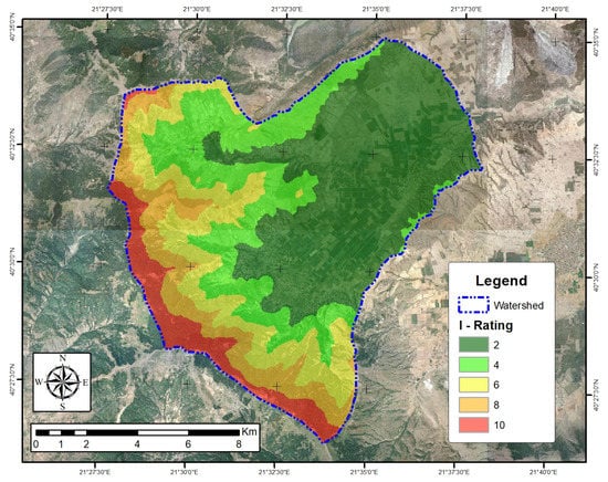 The parameter of rainfall intensity (I) is expressed using the modified Fournier index (MFI), which is the sum of the average monthly rainfall intensity recorded by the rain-gauge stations. The spatial distribution of this criterion was found using the spline interpolation method in order to also take into account the allocation of stations in the studied area. The values of the parameter I are distinguished by five classes between and , as shown in Table 1. The spatial distribution of the values of rain intensity is illustrated in Figure 3 with the higher values located in the southwest part of the studied area.