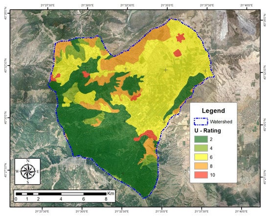 The land use parameter is mainly related to the infiltration rate as a result of the existing correlation between the surface characteristics that affect (sub)surface runoff, groundwater infiltration and debris flow. Land use information was extracted from the Corine land cover dataset [22], showing that a large part of the studied area is covered by mixed forests and agricultural areas, assigned with rates equal to 2 and 6, respectively (Figure 5). Forest generally favors infiltration, while agricultural areas allow more water to flow in the form of surface or subsurface runoff. Urban and sparsely vegetated areas represent only a fraction of the studied basin.
