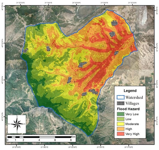 The weighted superimposition of the analyzed criteria resulted in the creation of the flood hazard map of the region. This map is illustrated in Figure 9 and shows that the zones with high/very high flood hazard risks are located in the central and northwestern part of the studied area. It is clear that the flood hazard follows the drainage network, and prone areas are those located near the rivulets. More important is the observation that seven out of the nine total inhabited small towns are located in areas of high or very high flood hazard risks. This is particularly apparent in two settlements in the northwestern part, which are “surrounded” by areas of very high risk. Accordingly, flood mitigation measures need to start from these locations, in order to support the flood resilience of the settlements.