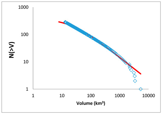 The statistical physics of seamounts and submarine volcanoes involves the evaluation of their volume–frequency distribution. Figure 2 presents the cumulative frequency-volume distribution P(>V) of Easter island seamounts as a function of V, along with the Q-exponential function that describes the data for V < Vc ≈ 1200 km3. The analysis of ESC volume-distribution (see Figure 2) leads to Q = 2.20 with an error of 0.01 which leads to q = 1.54. For V > Vc an exponential function describes the data, in agreement with the asymptotic behavior presented in Equations (7a) and (7b).