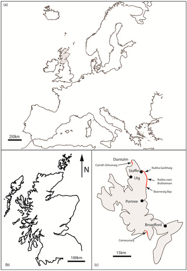 (a) Map of Europe with the position of Scotland highlighted; (b) map of Scotland showing the location of the Isle of Skye and (c) known dinosaur-bearing localities.