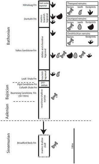 - Brusatte, S.L.; Clark, N.D.L. Theropod dinosaurs from the Middle Jurassic (Bajocian–Bathonian) of Skye, Scotland. Scott. J. Geol. 2015, 51, 157–164. [Google Scholar] [CrossRef]