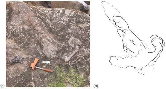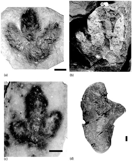 Some of the first dinosaur footprints to be found were described as Eubrontes (Figure 5a) and Grallator-like (Figure 5b) footprints in the Valtos Formation at Rubha nam Brathairean [5,7,17]. Although Eubrontes footprints have been tentatively assigned to a prosauropod trackmaker, the consensus is that they belong to a small theropod trackmaker [18].