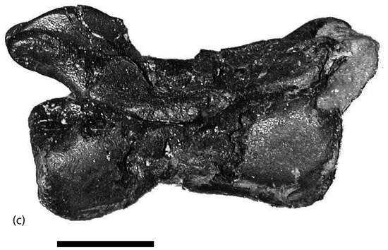 Few theropod remains have been found from the Middle Jurassic sediments of the Isle of Skye. A single tooth (Figure 7a,b) and a caudal vertebra (Figure 7c) were both found from sediments of the Valtos Sandstone Formation on the foreshore near to Valtos. The caudal vertebra appears superficially similar to vertebrae of coelophysoids, but a detailed analysis of the bone suggests that it is more likely a primitive coelurosaurian theropod [11].