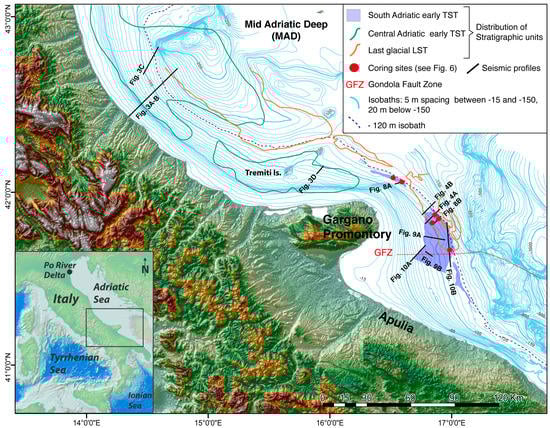 Post-glacial deposits overlying sequence 1 include a Late Pleistocene–Holocene TST and a late Holocene HST [56,69] (Figure 3); the TST displays vertical and lateral variability, from early to late sea level rise and from north to south, respectively. Only on the Adriatic shelf north of the MAD is the progressive sea level rise recorded by the back-stepping of barrier-lagoon systems [70,71,72]. On the Adriatic shelf south of the MAD, the TST is characterized by the stacking of three distinct units [66,73,74,75] (Figure 3). The upper or late TST unit is composed of laterally continuous, very low angle to flat seismic reflectors, gradually passing into the overlying HST progradational sigmoid (Figure 3). The middle TST unit shows a general progradational pattern on the inner shelf and has been related to a phase of increased sediment flux during the Younger Dryas cold reversal [73]. The lower or early TST unit lays directly on the erosional unconformity (ES1) capping sequence 1, resulting in the most laterally discontinuous and heterogeneous from north to south (Figure 1).