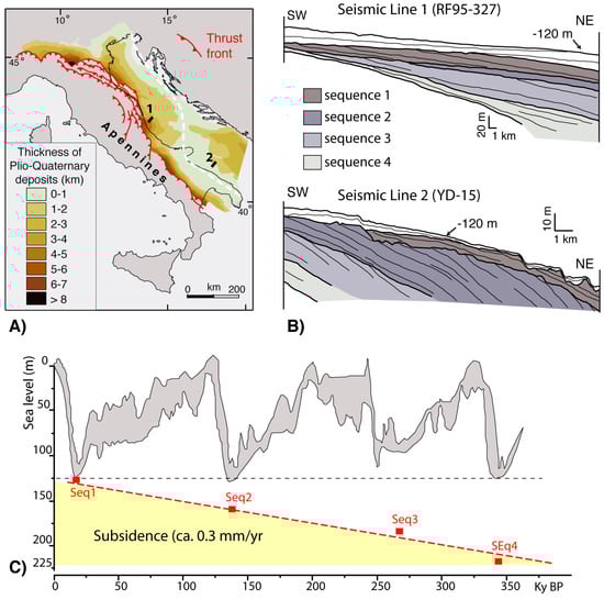 (A) (modified from [46]): The Adriatic Sea is part of the Apennine foreland basin, where sectors affected by greater subsidence were filled by foredeep deposits since the Pliocene. The depocenters of these foredeep deposits thin towards the flexural bulge (white dashed line), evidencing areas with contrasting rates of tectonic subsidence (greater along the North-Central Adriatic shelf) and uplift (greater along the South Adriatic shelf). (B) These regional tectonic trends are reflected by the vertical stacking pattern of depositional sequences recording ca. 100 ky glacio-eustatic cycles: sequences display a back-stepping geometry (i.e., landward shift) from oldest sequence 4 to sequence 1 in the Central Adriatic (Line 1). In contrast, the sequences show a fore-stepping trend in the South Adriatic, where lower subsidence and/or uplift prevail during the same interval [44,48]. (C) (Modified from [54]): Average subsidence rates of 0.3 mm/y in the Central Adriatic have been derived by comparing the depth of lowstand shorelines for each sequence (red rectangle) with sea level curves (enveloped as a grey field) reconstructed by different authors [61,62,63,64,65]. This value is twice the average sediment supply estimated for the same interval [54], thus allowing for a renewal of accommodation space during each cycle and promoting the back-stepping of sequences.
