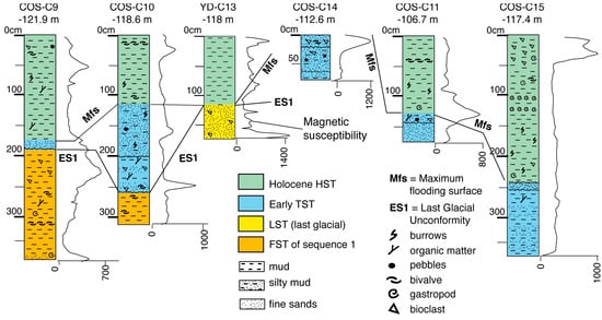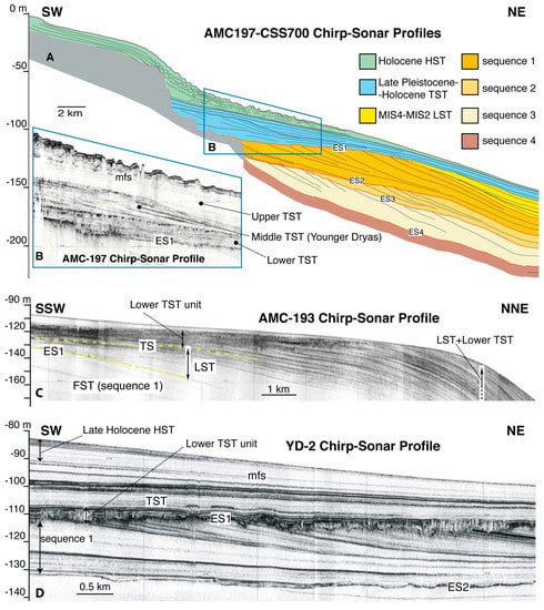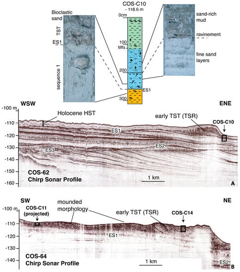The entire succession has been age-constrained based on the calibration of seismic stratigraphy with a set of multi-proxy chronological data derived from conventional cores and borehole data. These include δ18O records from planktic and benthic foraminifera, magneto-stratigraphy, calcareous nannoplankton bioevents and 14C dating [55,58,60,66,67]. Accordingly, the four sequences (numbered 1–4 top-down and bounded by erosional unconformities ES1 to ES4) formed between ca. 400 and 18–20 ka BP; the overlying units consist of post-last glacial transgressive (TST, between 18–20 and 5.5 ka BP) and highstand (HST, from 5.5 ka BP to present) deposits (Figure 3).
